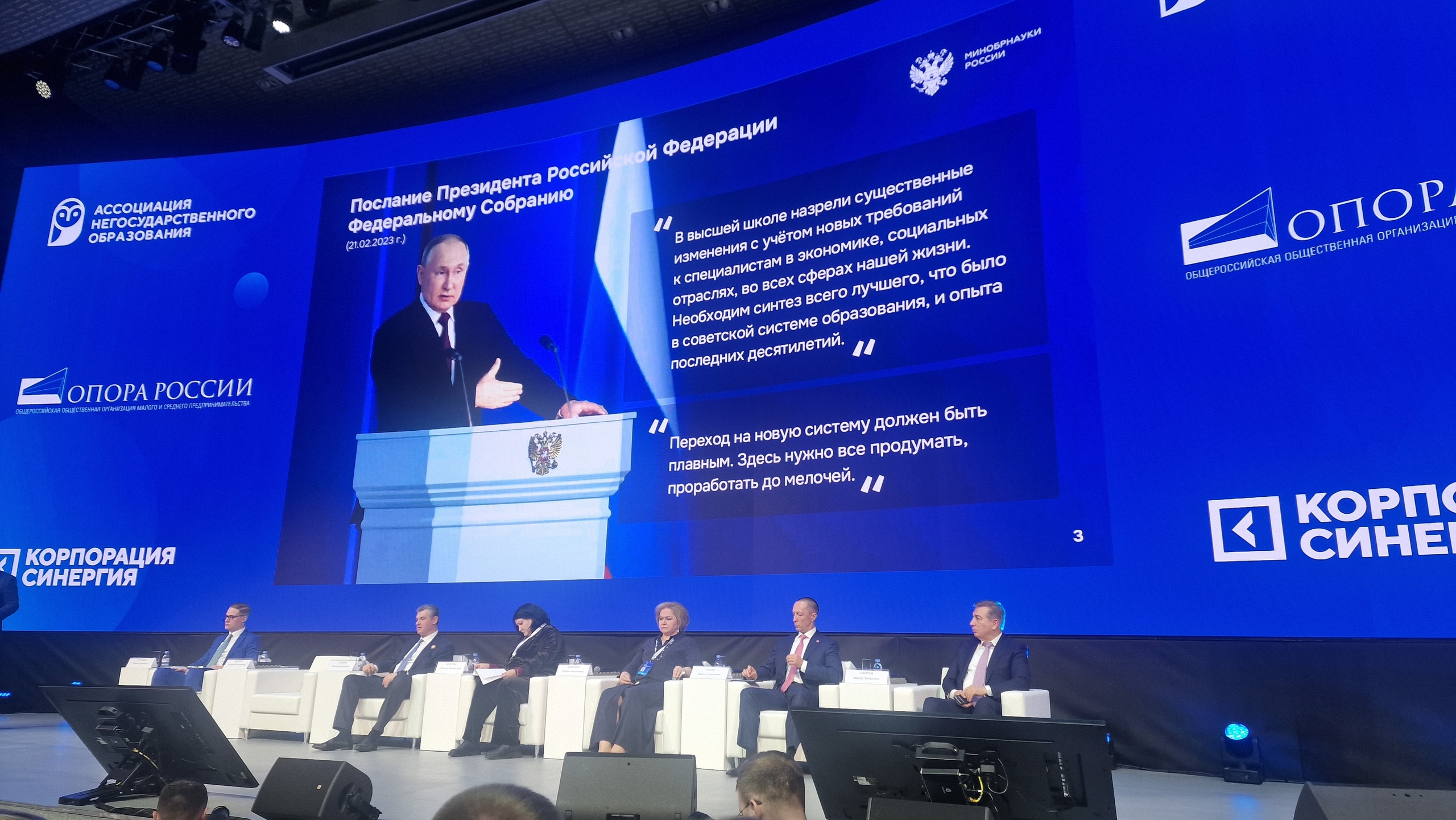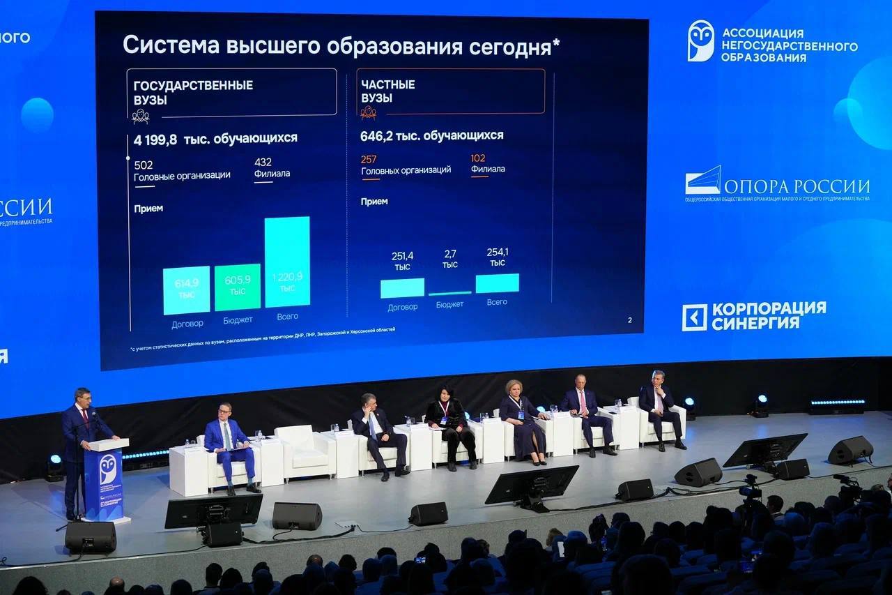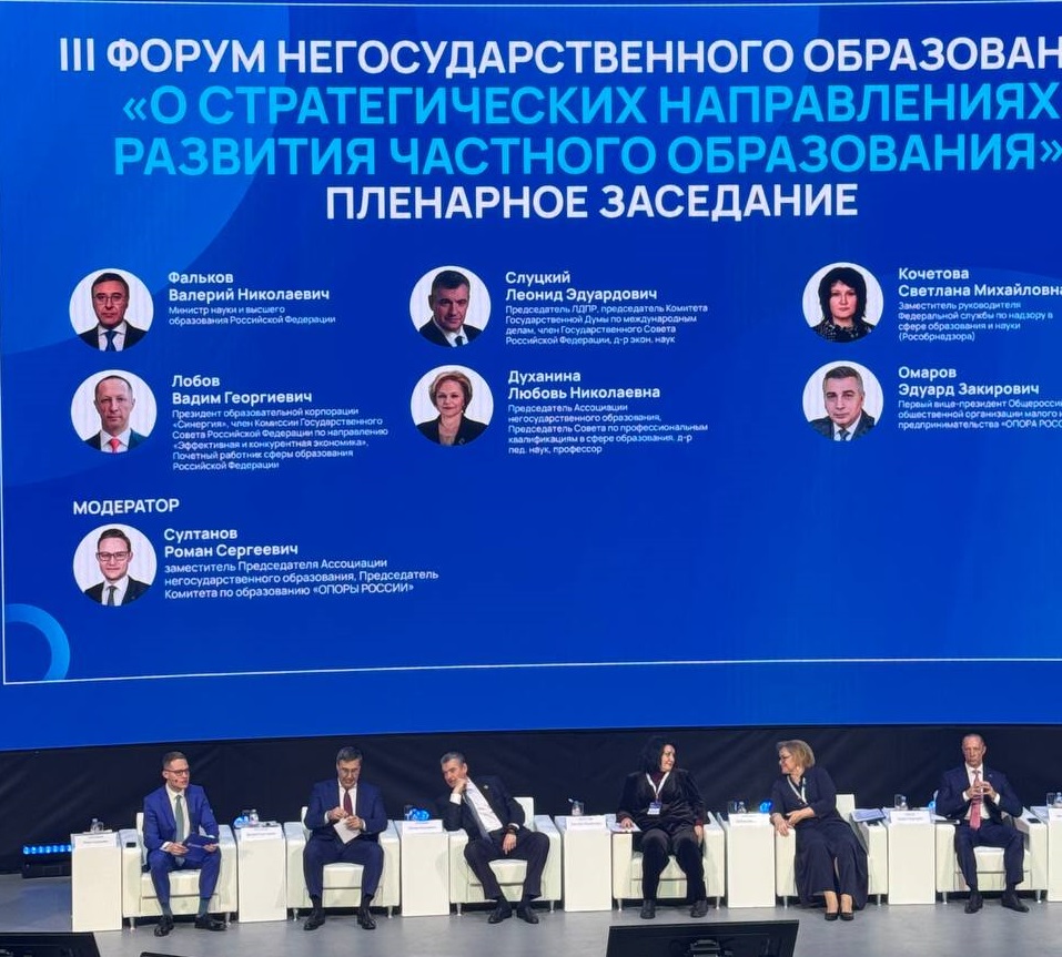 Пленарное заседание объединило первых лиц: министр науки и высшего образования РФ Валерий Фальков, заместитель руководителя Рособрнадзора Светлана Кочетова, председатель Ассоциации негосударственного образования Любовь Духанина, президент Корпорации «Синергия» Вадим Лобов, первый вице-президент «ОПОРЫ РОССИИ» Эдуард Омаров, Леонид Слуцкий.
